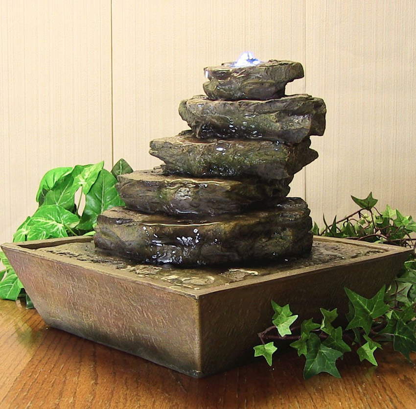Enjoy the bubbling water sounds of your own indoor water fountain featuring cascading rocks that create a mini waterfall effect. The natural style of this indoor fountain is constructed from polyresin material made to look like real stacked stones.