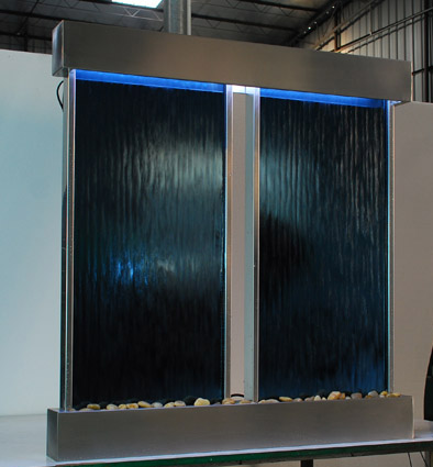 This wall mounted waterfall fountain by Red Monkey King has a blue mirror surface and aluminum frame.To learn more about this blue surface hanging wall fountain visit Red Monkey King.