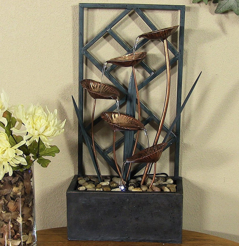 This tabletop fountain is called the wandering leaves and is a great size for display. With a copper style and trellis back, the fountain provides a zen like centerpiece for your room. The fountain has decorative river rocks to capture the water before it is recirculated through the pump back to the top of the unit. LED lighting provides illumination to help enhance the appearance.