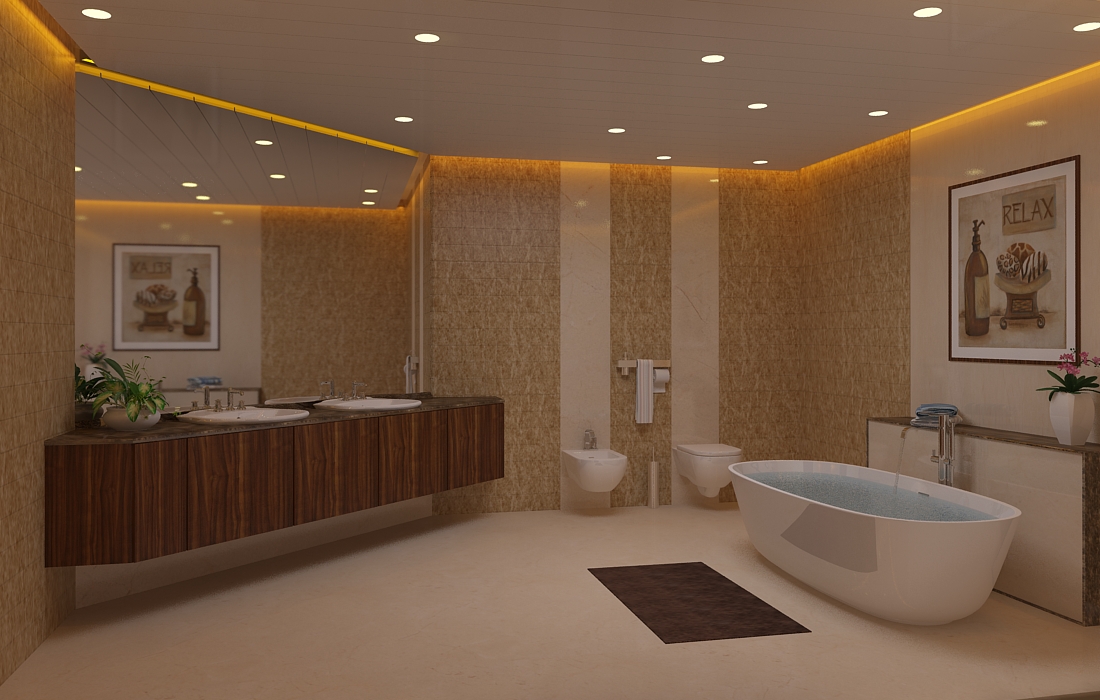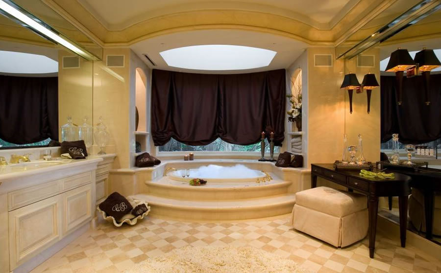 This bathroom interior design ideas is amazing! Look at the huge space! Tub stands on a pedestal and you can enjoy a swim by candlelight.One of the classic bathroom interior design images. This style is awesome for everyone. Soft colors give a sense of comfort and relaxation.